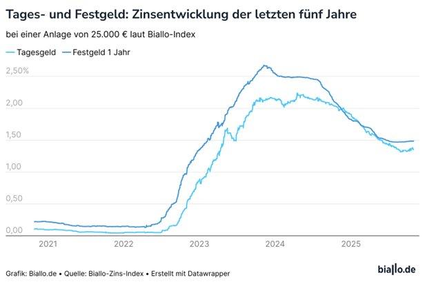 Für Sparer ging es in puncto Tages- und Festgeldzinsen in den letzten Jahren deutlich bergauf – und seit Juni 2024 wieder schrittweise bergab. Wer sich Ende 2023 oder Anfang 2024 für Festgeld mit mehreren Jahren Laufzeit entschieden hat, kann sich weiterhin über eine ordentliche Verzinsung freuen – und zwar im Idealfall jahrelang mit einer Vier vor dem Komma. Wer seinerzeit nicht zugegriffen und auf Tagesgeld gesetzt hat, hat hingegen das Nachsehen. Ein Beispiel: Wer etwa das entsprechend dem EZB-Einlagenzinssatz verzinste Tagesgeldangebot von Neobrokern wie Trade Republic nutzt und dort sein Tagesgeld liegen hat, kann seitdem mitverfolgen, wie die Zinszahlungen ab Sommer 2024 bis Juni 2025 kontinuierlich geringer ausfielen. Je nach…