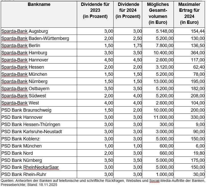 Wie die nachfolgende Übersicht zeigt, haben einzelne regionale Banken sehr hohe prozentuale Sätze an Dividenden für das zurückliegende Geschäftsjahr 2024 gezahlt. Bei den meisten kann man als Kunde insgesamt jedoch nur sehr wenig Geld investieren, da man nur eine geringe Anzahl von Anteilen erwerben kann. So lohnt sich hier kaum ein finanzielles Engagement. Hinzu kommt: Die wenigsten Genossenschaftsbanken bieten einen internetbasierten Mitgliedsantrag. Bei den meisten muss man weiterhin viel Papier händisch ausfüllen. Dieser Aufwand lohnt sich dann insgesamt kaum. Anders ist das natürlich, wenn man ohnehin im Geschäftsgebiet einer dieser Banken wohnt und Kunde eines der Geldhäuser ist. Warum sollte man dann nicht diese hohe Verzinsung mitnehmen? Firmenkontakt und Herausgeber…