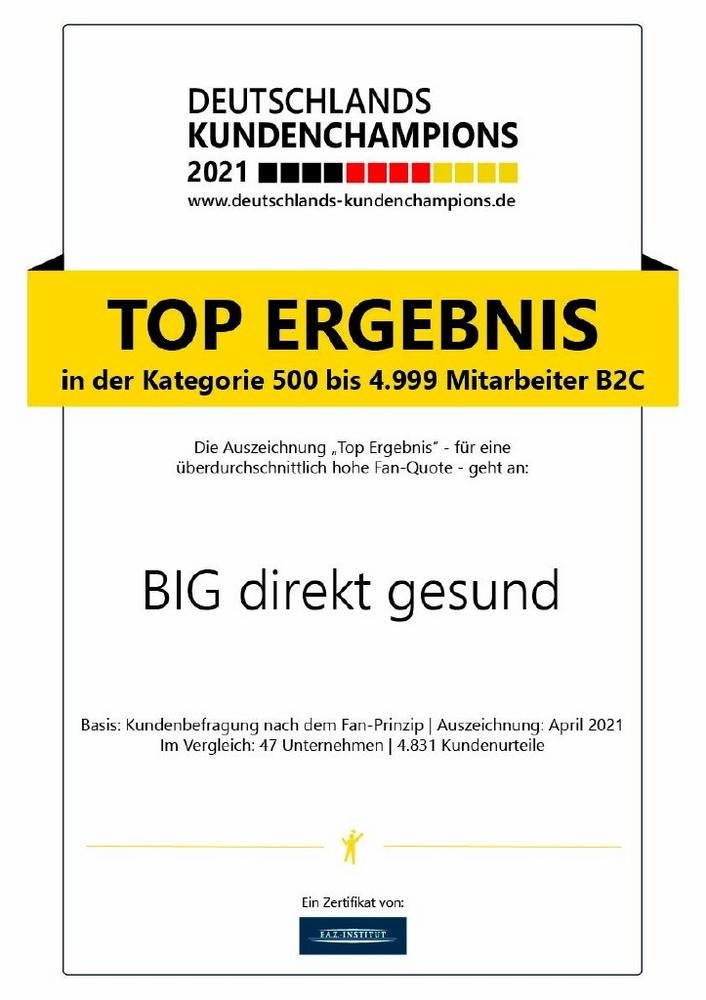 Zum dritten Mal hat BIG direkt gesund an dem branchenübergreifenden Wettbewerb „Deutschlands Kundenchampions“ teilgenommen und konnte sich erneut in den Kreis der Preisträger einreihen. Gemeinsam mit der Deutschen Gesellschaft für Qualität (DGQ) und dem F.A.Z.-Institut hat das Mainzer Marktforschungs- und Beratungsunternehmen 2HMforum. Unternehmen mit der besten Kundenbindung im Rahmen einer digitalen Veranstaltung ausgezeichnet. In dem bundesweiten Wettbewerb wurde die Fan-Quote, also der Grad der emotionalen Kundenbindung, von mehr als 200 Unternehmen quer durch alle Branchen gemessen und mehr als 21.000 wissenschaftlich fundierte Kundeninterviews geführt. „Wir schätzen die unabhängige Befragung unserer Kunden sowie die qualifizierte Auswertung und Analyse dieser Kundenfeedbacks. Wir profitieren von wertvollen Ergebnissen und Handlungsempfehlungen sowohl für unser strategisches…