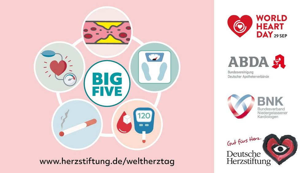 Weltherztag: Herz-Kreislauf-Erkrankungen sind weiterhin Todesursache Nummer eins in Deutschland und verursachen viele Tausend Fälle schwerer Invalidität. Die Deutsche Herzstiftung, der Bundesverband Niedergelassener Kardiologen (BNK) und die ABDA – Bundesvereinigung Deutscher Apothekerverbände sensibilisieren für die aktive Vorsorge der wichtigsten fünf Risikofaktoren Bluthochdruck, hohes LDL-Cholesterin, Übergewicht, Diabetes und Rauchen Jährlich sterben über 348.000 Menschen an den Folgen von Herz-Kreislauf-Erkrankungen wie Koronare Herzkrankheit (KHK), Herzinfarkt, Schlaganfall und Herzschwäche. Verursacht werden diese Erkrankungen (neben der erblichen Veranlagung) vor allem durch diese fünf Risikofaktoren: Bluthochdruck, hohes LDL-Cholesterin, Übergewicht, Diabetes und Rauchen. „Diese Risikofaktoren nennen wir die ,Big Five‘. Sie schädigen über viele Jahre hinweg auf unterschiedliche Weise Herz und Gefäße – manche lange unbemerkt im…