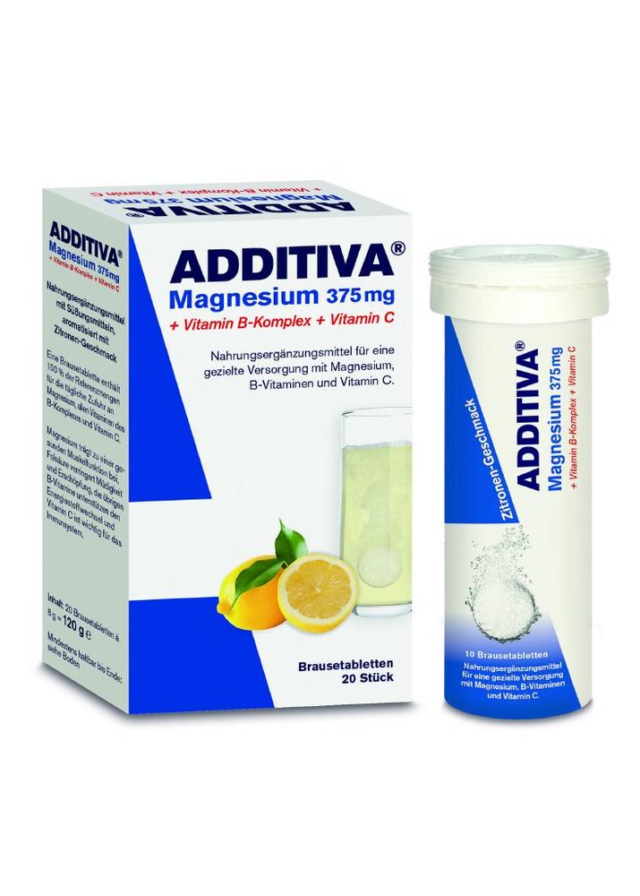 ADDITIVA® Magnesium 375 mg + Vitamin B-Komplex + Vitamin C bietet in einem Produkt wichtige Mineralien und Vitamine, die entscheidend für diverse Stoffwechselvorgänge sind. Magnesium trägt zu einer gesunden Muskelfunktion bei. Folsäure (Vitamin B9) verringert Müdigkeit und Erschöpfung, und die übrigen Vitamine des B-Komplexes unterstützen den Energiestoffwechsel. Vitamin C ist wichtig für das Immunsystem. Das Schöne: in ADDITIVA® Magnesium 375 mg + Vitamin B-Komplex + Vitamin C entsprechen alle Inhaltsstoffe zu 100% der NRV (Nährstoffreferenzwerte). Magnesium – unverzichtbar für den Organismus Magnesium ist ein Mineral, das der Körper nicht selber herstellen kann. Daher muss es über die Nahrung zugeführt werden – was in den heutigen stressigen Zeiten nicht immer funktioniert.…