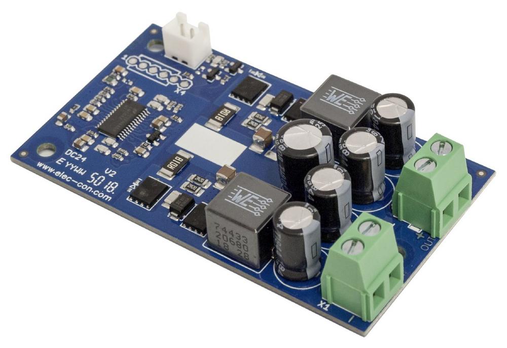 Elec-Con, Passauer Entwicklungshaus für kundenspezifische Leistungselektronik bis 1 KVA, stellt mit der Baureihe DC24xx-110-ISO eine Serie galvanisch getrennter Hochsetzsteller (Boost-Wandler) vor, welche bis +55° C ohne zusätzliche Kühlung betrieben werden kann. Bei einer Eingangsspannung von 18…32 V lässt sich eine Ausgangsspannung zwischen 48 und 75 V erzielen; diese wird hardwareseitig eingestellt. Die Leistung beträgt 110 W bei einem Wirkungsgrad von besser als 90%. Hochsetzsteller (auch als Boost-Wandler bezeichnet) werden benötigt, um beispielsweise aus der Standard-24-V-DC-Versorgung der Automatisierungstechnik höhere Gleichspannungen von 48 V (z.B. für Antriebstechnik) oder 54 V (z.B. für Power over Ethernet, PoE) zu gewinnen. Die höchste Ausgangsspannung erreicht der DC2475-110-ISO mit 75 VDC; der Maximalstrom liegt dann bei knapp…
