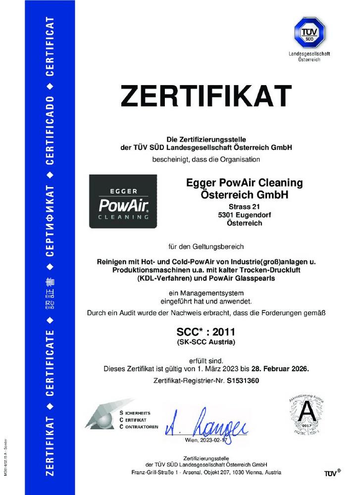 Industrycleaner Egger PowAir Cleaning GmbH certified by TÜV – SÜD until 2026 SCC* : 2011.