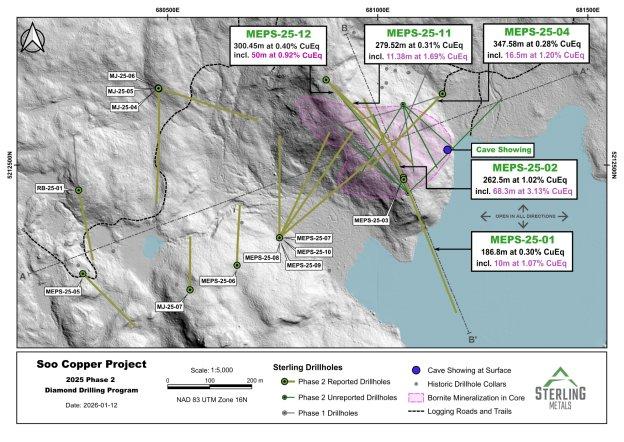 Sterling Metals Corp. (TSXV: SAG, OTCQB: SAGGF) („Sterling“ oder das „Unternehmen“) freut sich, über die neuen Analyseergebnisse aus seinem erweiterten und mittlerweile abgeschlossenen Bohrprogramm 2025 im Kupferprojekt Soo („Kupferprojekt Soo“ oder das „Projekt“) unweit von Batchewana Bay in Ontario zu berichten. Diese neuen Ergebnisse belegen die weitere Ausdehnung einer durchgehenden Zone mit porphyrischer Kupfermineralisierung, die erstmals Anfang letzten Jahres in Bohrloch MJ-25-01 entdeckt wurde und bei der man später herausfand, dass sie eine sehr hochgradige Bornitmineralisierung aufweist, wie bereits im Rahmen der Entdeckungsbohrung MEPS-25-02 berichtet (siehe Pressemitteilung vom 29. September 2025). Highlights – In den Bohrlöchern MEPS-25-11 und MEPS-25-12 wurden mächtige, hochgradige Kupfer-(Cu)-Abschnitte durchteuft, die mit dem in Bohrloch MEPS-25-02 entdeckten Mineralisierungstyp…