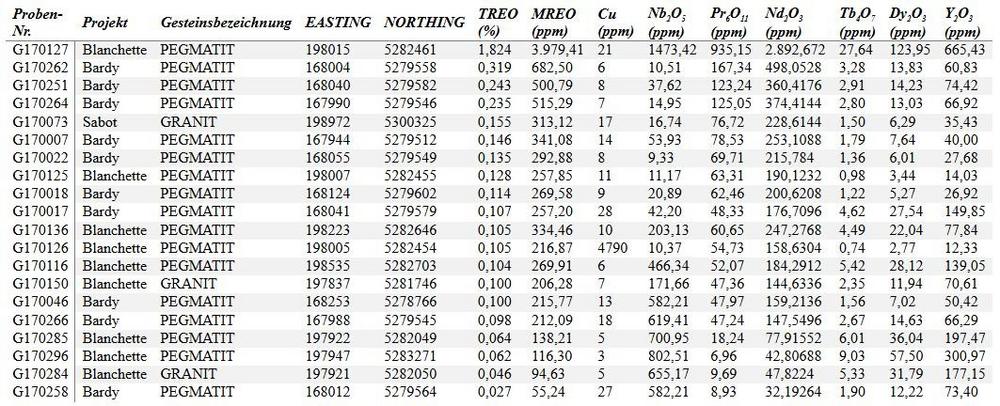North American Niobium and Critical Minerals Corp. bestätigt Funde einer Mineralisierung aus magnetischen Seltenerdmetallen und Niob in den Konzessionsgebieten Blanchette, Bardy und Sabot, u. a. 1,82 % TREO und 0,14 % Nb2O5