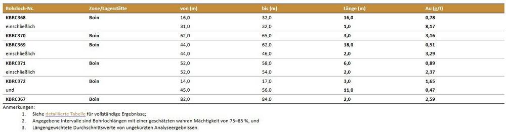 Newcore Gold Ltd. („Newcore“ oder das „Unternehmen“) (TSX-V: NCAU, OTCQX: NCAUF) freut sich, weitere Bohrergebnisse aus dem zu 100 % unternehmenseigenen Goldprojekt Enchi („Enchi“ oder das „Projekt“) in Ghana im Rahmen des 45.000 Meter umfassenden derzeitigen Bohrprogramms des Unternehmens bekannt zu geben. Im Rahmen von oberflächennahen Bohrungen im Umkehrspülverfahren (Reverse Circulation, „RC“) in der Goldlagerstätte Boin („Boin“) wurden mehrere Zonen einer Goldmineralisierung in geringer Tiefe durchteuft. Unter anderem wurde in Bohrloch KBRC370 ab 62 m Tiefe ein 3,0 Meter („m“) langer Abschnitt mit 3,16 Gramm Gold pro Tonne („g/t Au“) durchörtert. Im Bohrloch KBRC368 wurde ebenfalls eine Goldmineralisierung knapp unterhalb der Oberfläche angetroffen und ab 16 m Tiefe ein 16,0 m…