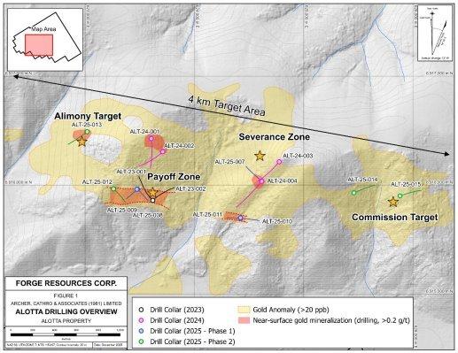 Forge Resources Corp. (CSE: FRG) (OTCQB: FRGGF) (FWB: 5YZ) („FRG“ oder das „Unternehmen“) freut sich, die folgenden Ergebnisse aus seinem Projekt Alotta im Yukon bekannt zu geben: die vollständigen Golduntersuchungsergebnisse aus Bohrloch ALT-25-012 in der Zone Payoff, in dem 3,4 g/t Gold über 44,75 Meter ab 256,23 Metern durchteuft wurden, sowie die Entdeckungsergebnisse aus Bohrloch ALT-25-013 in der Zone Alimony, das 1,04 g/t Gold über 55,52 Meter ab 91,99 Metern ergab (Abbildung 1). Highlights: – Im Folgenden einige der endgültigen Ergebnisse aus dem Bohrloch ALT-25-012 in der Zone Payoff: o 76,93 m mit einem Gehalt von 2,03 g/t Au ab 223 Metern, einschließlich 44,75 m mit einem Gehalt von 3,4 g/t Au und 8,16 m mit einem…