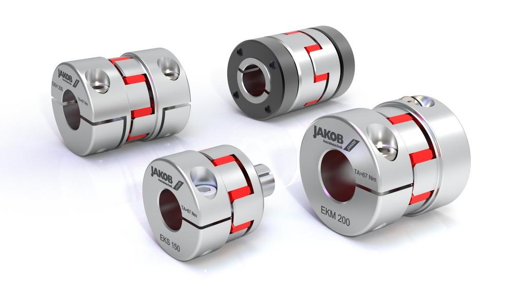 Elastomerkupplungen sind steckbare, spielfreie und flexible Wellenkupplungen für alle kleinen und mittleren Drehmomente bis 2000 Nm. Das Verbindungs- und Ausgleichselement ist ein Kunststoffstern mit evolventenförmigen Zähnen und hoher Shore-Härte. Dieser wird formschlüssig, mit leichter Vorspannung in zwei hochpräzise gefertigte Naben mit klauenförmigen Nocken eingesetzt. Der elastische Kupplungsstern kann geringfügige Wellenversätze ausgleichen, ist elektrisch isolierend und weist ein gutes Schwingungsdämpfungsverhalten auf. Es stehen mehrere Standardvarianten mit spielfreier, kraftschlüssiger Welle-Nabe-Verbindung zur Auswahl, welche auch ohne zusätzliche Passfeder eine sichere Drehmomentübertragung gewährleisten. Die Serien EKM, ESM-A, EKH und EKS mit Spreizkonus sind im Standardprogramm erhältlich, auf Anfrage sind auch individuelle Lösungen möglich. Technische Daten können auf der Website www.jakobantriebstechnik.de eingesehen oder direkt bei…