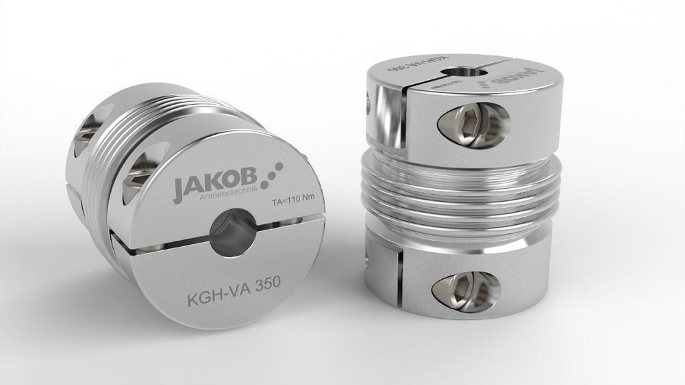 JAKOB Antriebstechnik bietet die Metallbalgkupplung KGH, die in der äußerst montagefreundlichen Halbschalennabenausführung gefertigt wird, auch als Edelstahlvariante an (KGH-VA). Montage und Demontage der Kupplung sind so selbst in beengten Einbauverhältnissen keine Schwierigkeit mehr. Die festen Nabenhälften werden auf die Welle aufgelegt und mit den losen Halbschalenstücken verschraubt. Gerade bei feststehenden Wellenzapfen kann der Servicefall bedeuten, dass die Antriebs- und/oder Abtriebseinheit umständlich demontiert werden müssen, was somit entfällt. Durch die rostfreie Edelstahlbauweise ist sie auch für Einsätze im Lebensmittelbereich und der Medizintechnik hervorragend geeignet. Die Reihe KGH-VA ist verschleiß- und wartungsfrei, bis 350°C einsetzbar, umfasst Wellendurchmesser von 7–85mm, Drehmomentbereiche von 10 bis 1200Nm und ist in variabler Baulänge mit 2-, 4-…