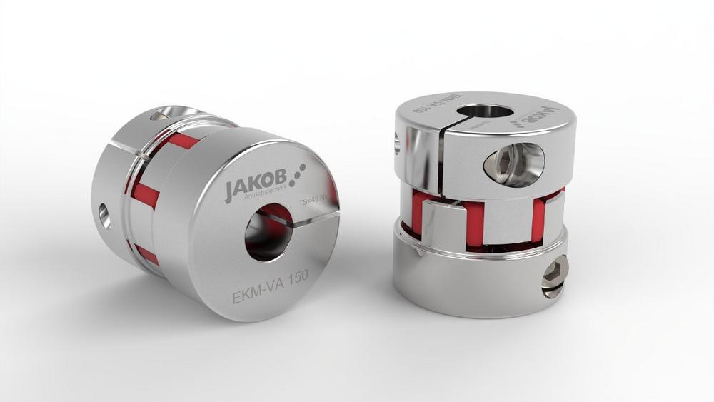 The elastomer couplings from Jakob have been expanded by a series. With the new EKM-VA, the tried-and-tested EKM type has a stainless steel version. One of the strengths of the material is its resistance to chemicals, such as those used for cleaning in the food industry. Elastomer couplings are pluggable, backlash-free and flexible shaft couplings for all small and medium torques up to 2000 Nm. The connecting and compensating element is a plastic star with involute-shaped teeth and a high Shore hardness. This is inserted in a form-fitting manner with a slight preload in two high-precision hubs with claw-shaped cams. The flexible star coupling can compensate for minor shaft misalignments,…