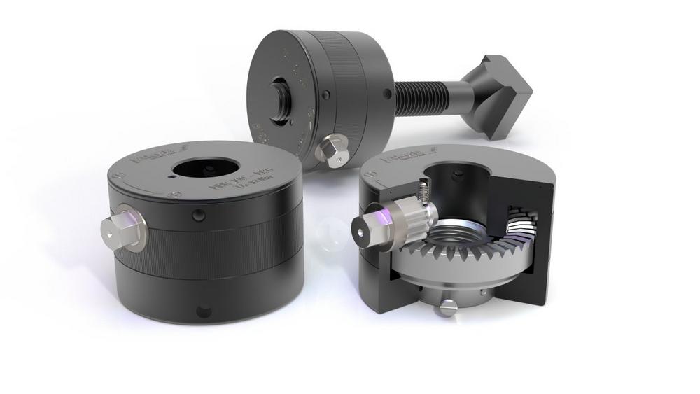 JAKOB Antriebstechnik hat mit der Baureihe MDR eine universell einsetzbare Kraftspannmutter mit seitlich angeordnetem Bediensechskant und Durchgangsgewinde im Sortiment. Die MDR-Reihe ergänzt die beiden Spannmuttertypen MCA und MDA mit Bedienung von oben, die sich seit vielen Jahren in den unterschiedlichsten Einsatzgebieten hervorragend bewährt haben. Ganz neu ergänzt die Baugröße 150 mit 150 kN Nennspannkraft die Auswahl. Wesentliches Konstruktionsmerkmal der MDR-Spannmutter ist ein spezielles Kronenradgetriebe mit rechtwinkliger Umlenkung der Rotation zur Vervielfältigung des Anzugsmomentes. Proportional zum Anzugsmoment wird die Spannkraft sicher und kontrolliert aufgebaut. Hierdurch werden mit einfachster manueller Bedienung hohe Spannkräfte bei maximaler Betriebssicherheit gewährleistet. Bei der Gewindegröße M30 wird zum Beispiel der üblicherweise benötigte schwere SW46-Schlüssel durch den SW14-Bediensechskant…