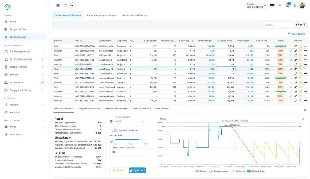 Die numi Bestandsmanagement Software unterstützt Einкäufer und Disponenten dabei, die richtigen Bestände zur richtigen Zeit am richtigen Ort zu positionieren. In vielen Unternehmen führen statische Bestandsparameter, ungenaue Lieferzeiten und wenig dynamische Losgrößen dazu, dass MRP-Läufe Fehlteile oder Überbestände erzeugen. Herkömmliche ERP-Systeme erlauben selten, die Auswirkungen von Lieferzeiten, Ziel-Service-Leveln oder Bestellfrequenzen zu simulieren und zu optimieren. Zudem werden KI-gestützte Prognosen oft nicht in die Nachschubplanung integriert. Die numi Bestandsmanagement Software löst genau diese Herausforderungen: Algorithmen optimieren Bestandsparameter automatisch, berechnen tatsächliche Lieferzeiten und spielen transportoptimierte Bestellvorschläge per Knopfdruck zurück ins ERP – damit Einkaufsbestellungen automatisch angelegt werden. Ergebnisse durch die numi Bestandsmanagement Software Bis zu –15 % weniger Bestände durch KI-basierte Optimierung Bis…