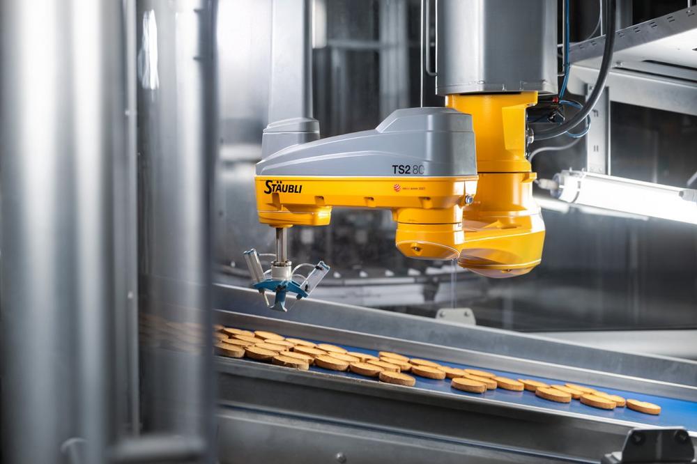 Bolletje, a Dutch premium manufacturer of bakery products like rusk, has automated its quality inspection process. A very compact cell with a camera and a Stäubli TS2-80 HE four-axis robot can inspect up to 1,200 rusks per minute. In addition, the generated data is analyzed using vision AI to support system optimization. The TS2-80 HE, designed for hygienic applications, picks up to 80 products per minute and transfers them to the N.i.O. (reject) conveyor. How do you check the quality of 4,000 rusk slices leaving a 200-meter-long oven line on a four-meter-wide conveyor belt every minute? You employ a staff of five, each with a keen eye and quick reactions…
