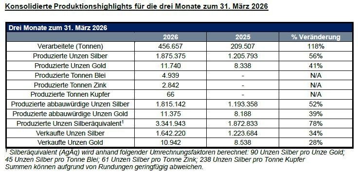 Endeavour Silver Corp. („Endeavour“ oder das „Unternehmen“ – https://www.commodity-tv.com/ondemand/companies/profil/endeavour-silver-corp/) (NYSE: EXK; TSX: EDR) meldet für das erste Quartal 2026 eine Produktion von 1.875.375 Unzen Silber („Unzen“), 11.740 Unzen Gold, was zusammen mit der Produktion von Basismetallen einer Silberäquivalentproduktion(1) („AgÄq“) von 3,3 Millionen Unzen entspricht. Alle Dollarbeträge sind in US-Dollar ($) angegeben. „Wir freuen uns, für das erste Quartal 2026 eine robuste Produktion vermelden zu können, die durch die stabile Leistung bei Terronera geprägt war, wo verbesserte Gehalte und Gewinnungsraten ohne nennenswerte Betriebsunterbrechungen erzielt wurden“, kommentierte Dan Dickson, Chief Executive Officer. „Guanaceví zeigte weiterhin eine konstante Leistung, und Kolpa hat nicht nur seine Aufbereitungskapazitäten trotz widriger Wetterbedingungen ausgebaut, sondern ist nun…