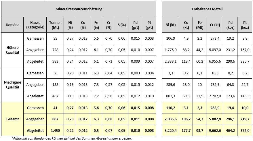 Gemessene und angezeigte Ressourcen: Anstieg um 46 % auf 2,1 Millionen Tonnen Nickel (0,87 Milliarden Tonnen mit 0,23 % Ni), einschließlich eines höhergradigen Bereichs von 0,77 Milliarden Tonnen mit 0,25 % Ni. Abgeleitete Ressource: Anstieg um 47 % auf 3,2 Millionen Tonnen Nickel (1,45 Milliarden Tonnen mit 0,22 % Ni), einschließlich eines höhergradigen Bereichs von 0,98 Milliarden Tonnen mit 0,24 % Ni. Explorationsziel[1] : Potenzial für weitere 0,5–1,4 Milliarden Tonnen mit 0,21–0,22 % Ni. Nickelgebiet Timmins: Umfasst nun insgesamt acht Lagerstätten mit 10,1 Millionen Tonnen gemessenen und angezeigten Nickelvorkommen (4,3 Milliarden Tonnen mit einem Nickelgehalt von 0,24 %) und 12,5 Millionen Tonnen abgeleiteten Nickelvorkommen (5,4 Milliarden Tonnen mit einem…