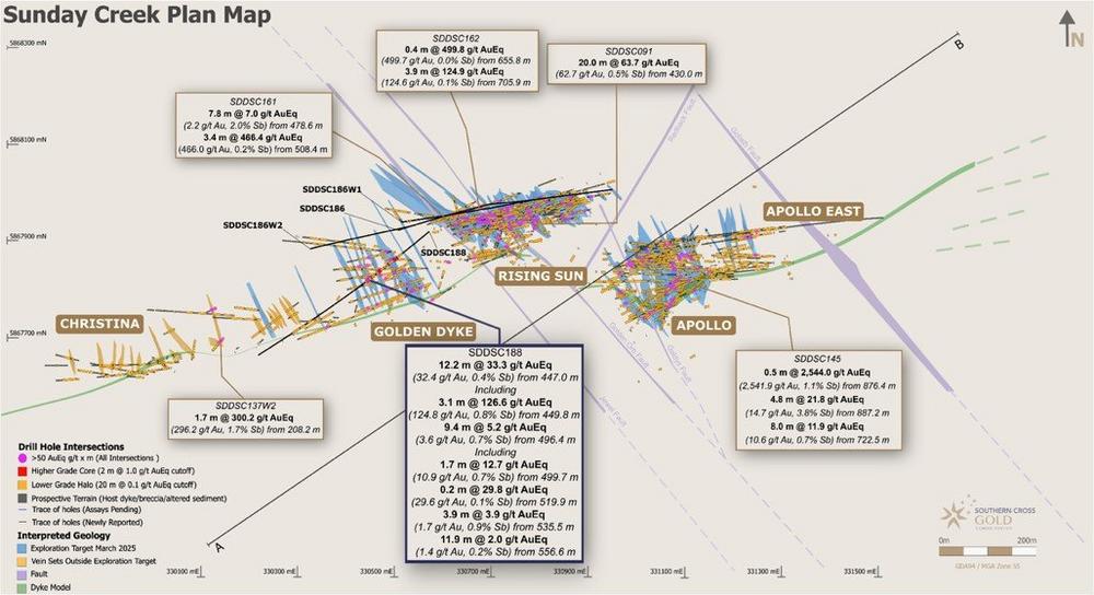 Southern Cross Gold Consolidated Ltd (“SXGC”, “SX2” or the “Company”) (TSX:SXGC) (ASX:SX2) (OTCQX:SXGCF) (Frankfurt: MV3.F) (- https://www.commodity-tv.com/… -) announces results from four drillholes from the 100%-owned Sunday Creek Gold-Antimony Project in Victoria (Figures 1 to 5). Best results included 12.2 m @ 32.4 g/t Au from 447.0 m in drillhole SDDSC188, including the highest individual Au assay (0.2 m @ 1,050 g/t Au) in Golden Dyke to date. Five High Level Takeaways: • Best Gold Discovery at Golden Dyke: Best gold intersection drilled at Golden Dyke to date – 12.2 m @ 33.3 g/t AuEq (32.4 g/t Au, 0.4% Sb) from 447 m depth. This confirms Golden Dyke as a major…