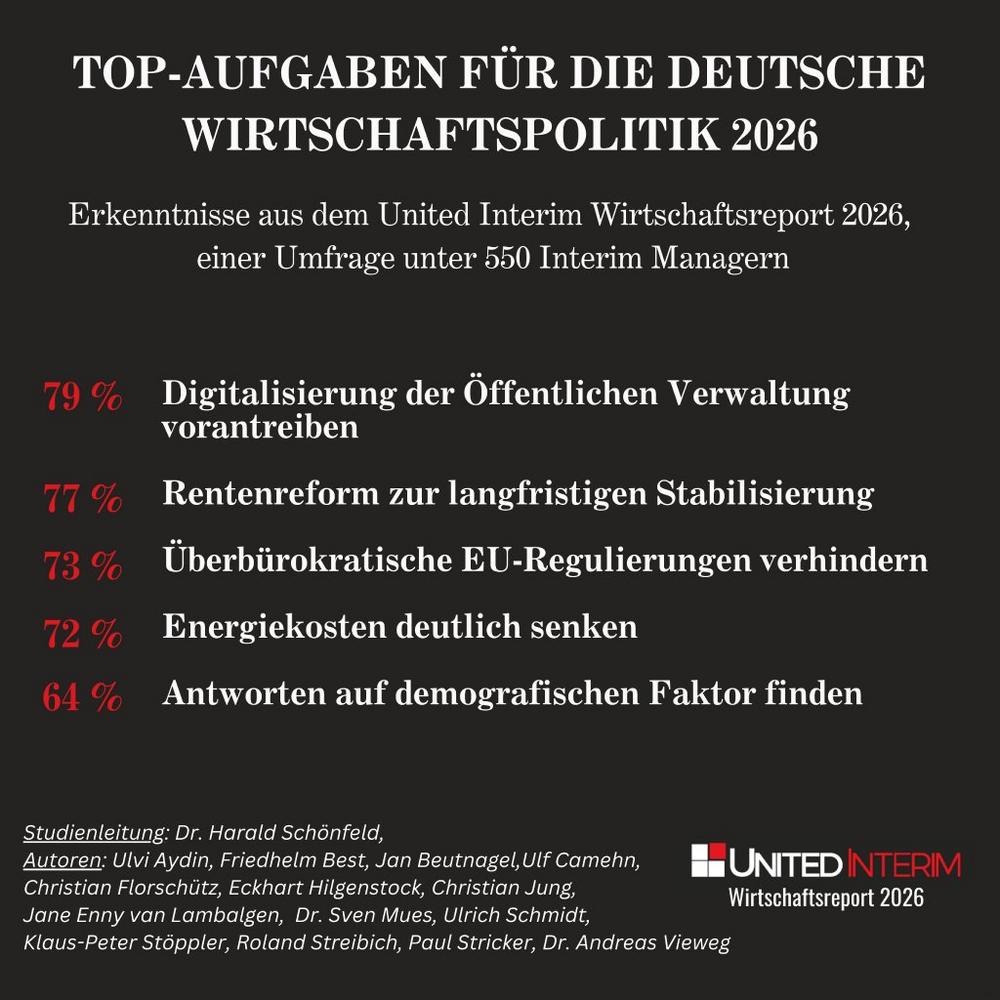 Führende Interim Manager zeigen auf, wie Deutschland wieder Schwung gewinnt: Ulvi Aydin, Friedhelm Best, Jan Beutnagel, Ulf Camehn, Christian Florschütz, Eckhart Hilgenstock, Christian Jung, Jane Enny van Lambalgen, Dr. Sven Mues, Ulrich Schmidt, Klaus-Peter Stöppler, Roland Streibich, Paul Stricker, Dr. Andreas Vieweg. Die Digitalisierung der Öffentlichen Verwaltung, eine Rentenreform zur langfristigen Stabilisierung, der Bürokratieabbau insbesondere auf EU-Ebene und eine deutliche Senkung der Energiekosten sind die vier wichtigsten Aufgaben für die deutsche Wirtschaftspolitik 2026/27. Dies geht aus dem Wirtschaftsreport 2026 hervor, den eine Reihe renommierter Interim Manager – Ulvi Aydin, Friedhelm Best, Jan Beutnagel, Ulf Camehn, Christian Florschütz, Eckhart Hilgenstock, Christian Jung, Jane Enny van Lambalgen, Dr. Sven Mues, Ulrich Schmidt, Klaus-Peter…