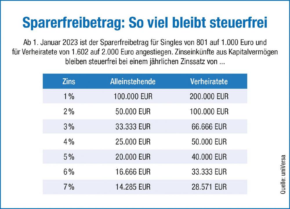 Für Sparer gibt es positive Nachrichten: Zwar ist die Inflation nach wie vor auf einem Rekordniveau, aber die Zeiten von Nullzinsen scheinen vorbei zu sein. Zudem wurde der Sparerfreibetrag zum Jahreswechsel erhöht. Wer Geld anlegt, bekommt seit einigen Monaten endlich wieder Zinsen, sei es für Tagesgeld oder andere Sparanlagen. Die Tendenz ist sogar weiter steigend. Zudem hat der Staat den Sparerpauschbetrag zum Jahreswechsel auf 1.000 Euro (Vorjahr 801) erhöht. Damit bleiben bei einem Zins von zwei Prozent die Erträge einer Geldanlage über 50.000 Euro steuerfrei, bei vier Prozent über 25.000 Euro. Erst bei Einkünften aus Kapitalvermögen über dem Sparerfreibetrag wird eine Abgeltungssteuer von 25 Prozent zuzüglich gegebenenfalls Solidaritätszuschlag und Kirchensteuer…