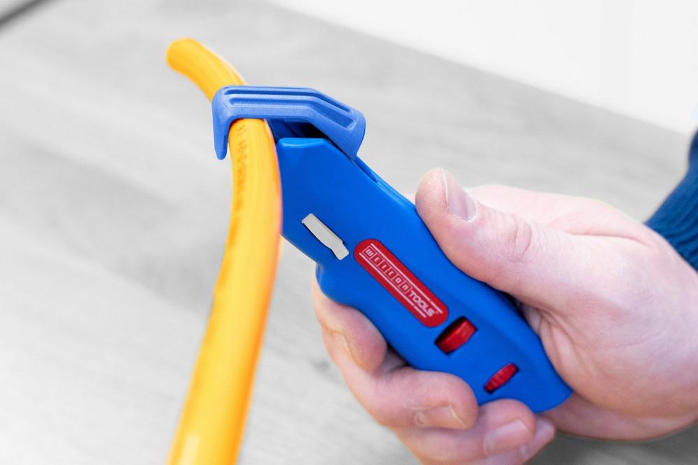 Kabelmesser dienen zum präzisen, schnellen und sicheren Entfernen der Isolierung von Rundkabeln. Die Produktfamilie der Weicon Tools Kabelmesser umfasst verschiedene Typen, die unterschiedliche Zusatzfunktionen aufweisen und so den individuellen Anwendungsbedingungen entsprechen. Für Kabel, die sich nicht einfach per Rund- und Längsschnitt entmanteln lassen, hat Weicon Tools ein Werkzeug entwickelt, mit dem zusätzlich ein Spiralschnitt möglich ist und mit dem anspruchsvolle Isolierungen leicht entfernt werden können – das Kabelmesser No. S 4-28 Spiral. Das Messer verfügt über einen Haltebügel aus glasfaserverstärktem Polyamid und ist für alle gängigen Rundkabel mit einem Durchmesser von 4-28 mm geeignet. Mit dem drehbaren Innenmesser können Rund-, Längs- und Spiralschnitte sowohl an weichen als auch an harten…