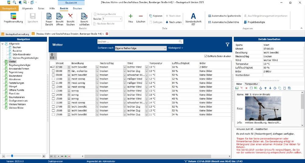 Bautagebuch 2025 ist ein Programm zur umfassenden Dokumentation des Bauablaufs sowie zur Erstellung und Verwaltung von Bautagebüchern und Baustellenberichten. Im Gegensatz zu Cloud- oder Mietlösungen fallen keine laufenden Kosten an und die Datenhaltung erfolgt komplett auf der eigenen Hardware-Infrastruktur. Auch rechtlich sind Planer mit dem Bautagebuch 2025 auf der sicheren Seite, denn damit lassen sich Gründe für Terminverzögerungen, Baumängel oder Vergütungsansprüche jederzeit schlüssig rekonstruieren. Wird das Bautagebuch kontinuierlich geführt und gepflegt, entsteht ein umfassendes Protokoll der Bauausführung, das Baustellenaktivitäten lückenlos dokumentiert, eine ordnungsgemäße Objektüberwachung gemäß HOAI nachweist und so Haftungsrisiken vorbeugt. Die optionalen Module Mängelmanagement und Mängelmanagement Web ermöglichen darüber hinaus eine schnelle und rationelle Erfassung und Verfolgung von Baustellenmängeln.…