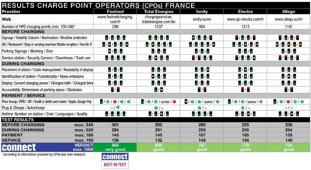 The media brand connect has tested the charge point operators (CPOs) in France this year, for the second time. The result: Fastned wins, followed by Total Energies and Ionity. The five CPOs tested were Allego, Electra, Fastned, Ionity and Total Energies. For the evaluation of the charging station operators, test drives took place between the end of July and the end of August 2024; there were some retests at the beginning of September. The test drivers covered around 1,800 kilometres in France and visited 25 charging stations. The test drivers completed a comprehensive evaluation form at each charging stop: about the charging station, the actual charging process and test calls…